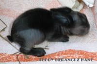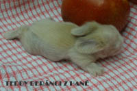 Teddy králíčci se narodí a na zádech mají tzv. klín (viz obrázek). Klín mají i hodně chlupatí lvíčci, takže není zcela rozhodující. Králíček, který se narodí bez klínu nemůže být nikdy teddy. Již ve dvou týdnech je teddy králíček krásně chlupatý. Specifické je tzv. „kuřecí“ chmýří, které je dobře viditelné na čumáčku mezi fousky. Ve věku 2 měsíců je srst na první pohled skoro stejná jako u dospělého králíčka, je po prvním línání.